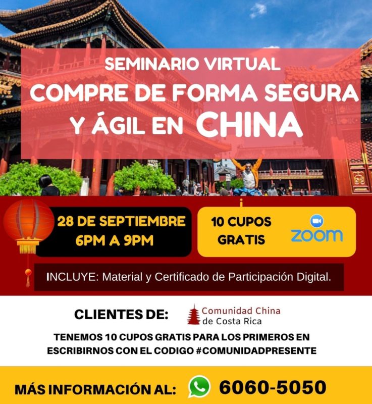 La comunidad empresarial China en Costa Rica, enseñara a empresarios a importar materia prima o productos de China de forma ágil y segura, esto será posible de forma virtual a través de un seminario que organiza la Comunidad China de Costa Rica y el Instituto Iberoamericano para el próximo 28 de septiembre, de 6:00 p.m. a 9:00 p.m.